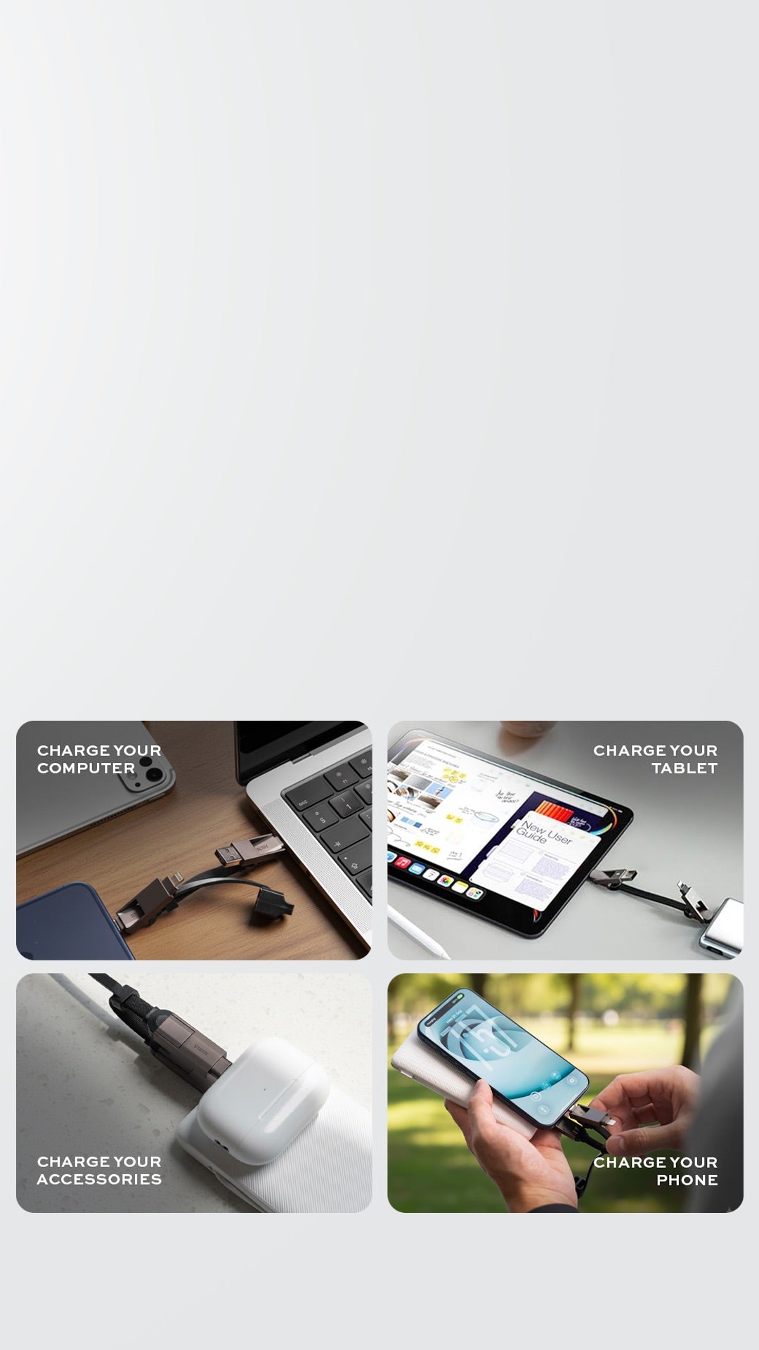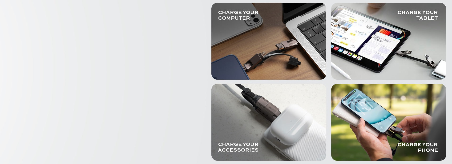 • Universal Compatibility. Connect any portable device to any power source with ease. This 4-in-1 multi charging cable offers versatility like no other: USB to USB-C, USB to Lightning, USB-C to USB-C, and USB-C to Lightning.