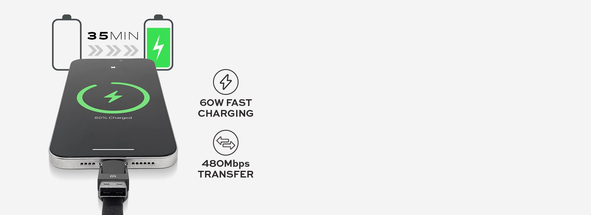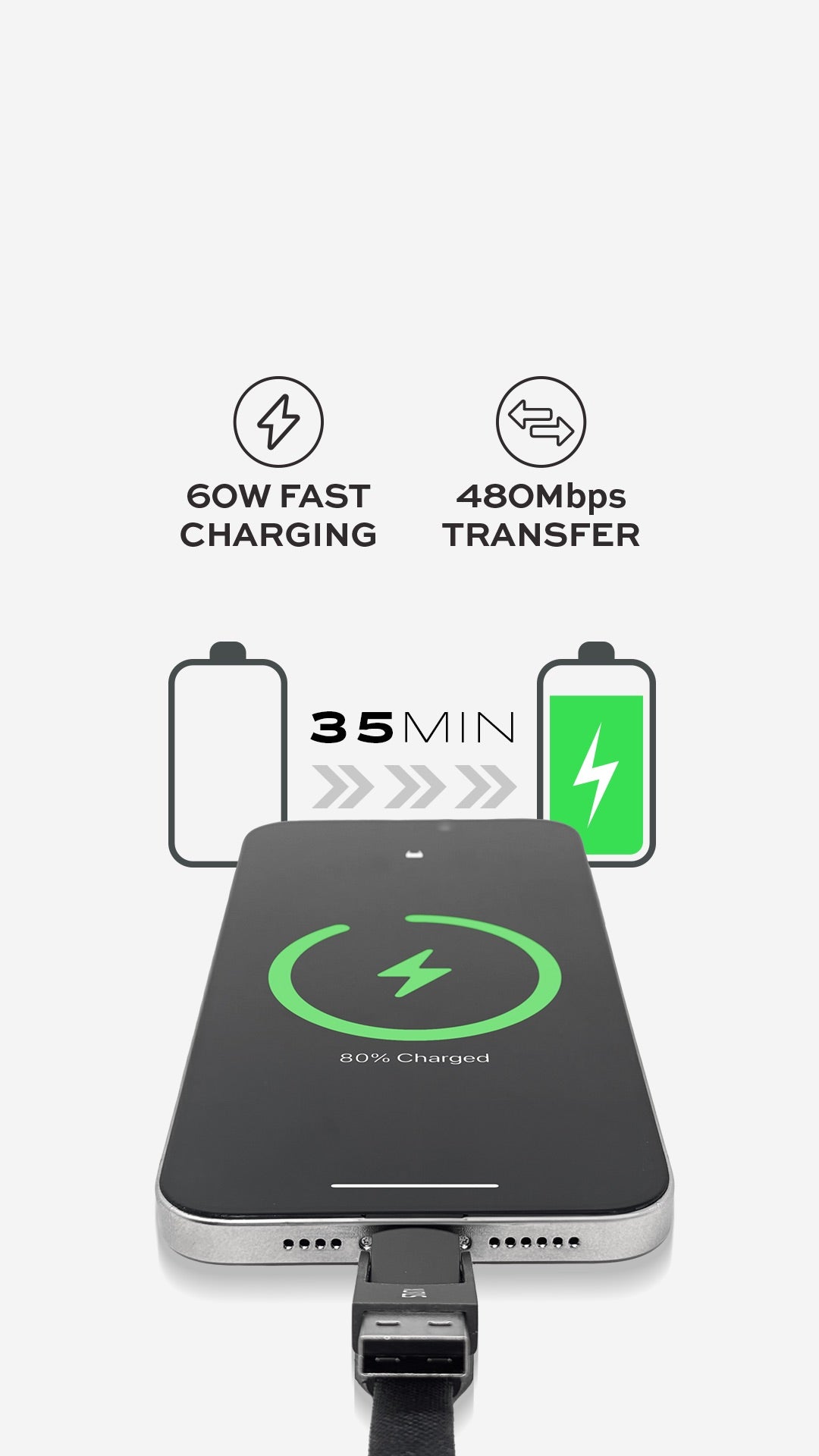 • 60W Fast Charging & High-Speed Data Transfer. Experience lightning-fast charging and data sync with the 60W USB-C cable, delivering up to 60W charging speed and up to 480Mbps data transfer rate. Transfer 1GB files in just 20 seconds. Note: For optimal performance, use a USB-C fast charger.