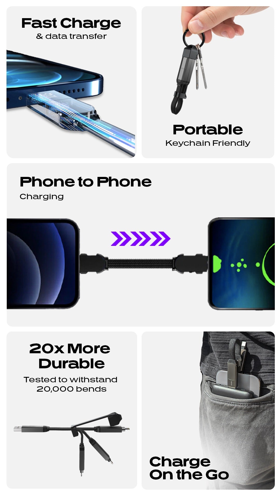 KeyCharge is small and lightweight, making it easy to carry with you wherever you go. A keychain-sized charging cable to simplify your life on-the-go.