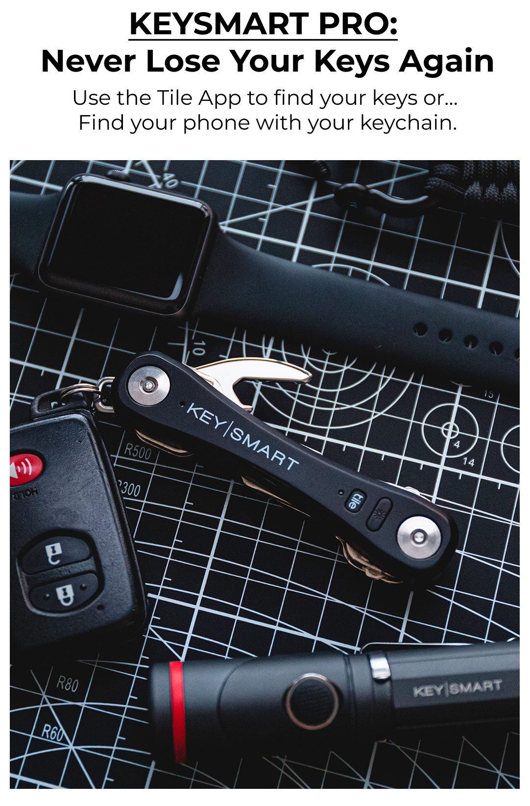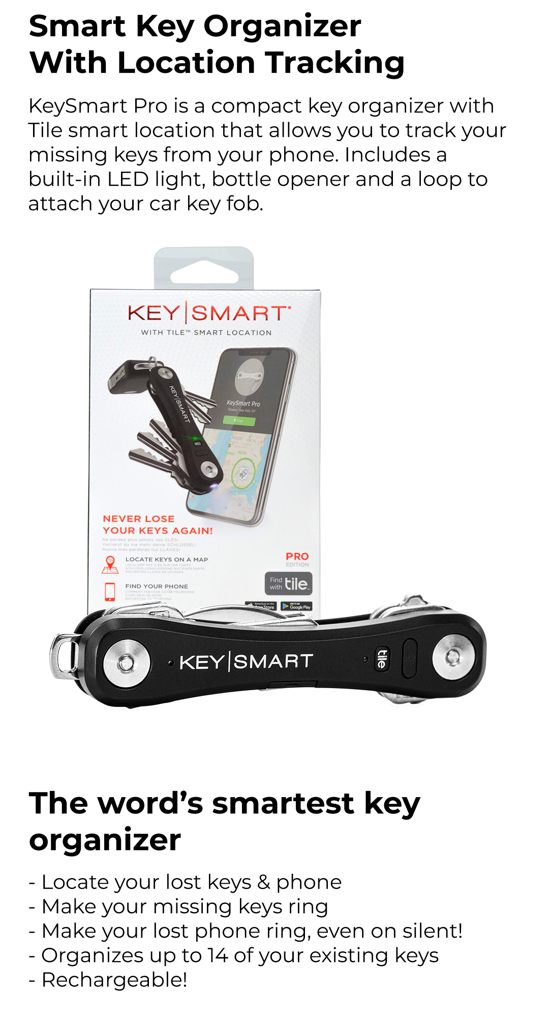 KeySmart Pro is a smart key organizer holding up to 14 keys and giving you peace of mind knowing your keys are never lost. Use the free Tile™ app and 150ft Bluetooth range to find your KeySmart Pro if you ever lose it, or to ring your lost phone even if it's on silent. The KeySmart Pro holds a charge for up to 45 days and you can recharge it with the included micro USB cable. It also has a super bright, built-in LED flashlight.