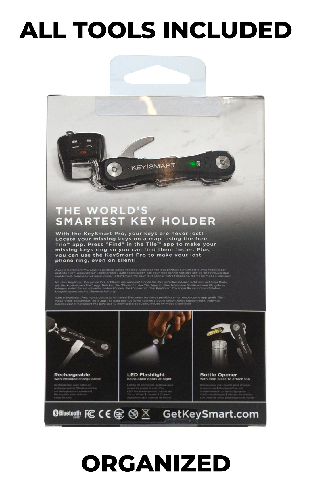 This bundle comes with a KeySmart Pro key organizer with Tile smart location that stores up to 14 keys and gives you the peace of mind knowing your keys are never lost, 5-in-1 MultiTool that combines 5 tools and fits in your key organizer and MagConnect, a powerful magnetic accessory that enables you to quickly attach or disconnect your keys from your fob.